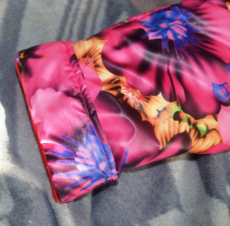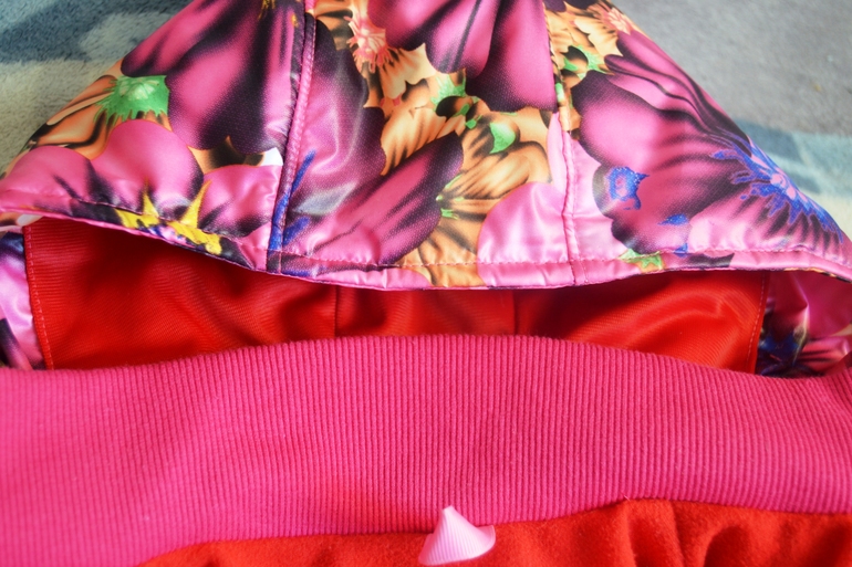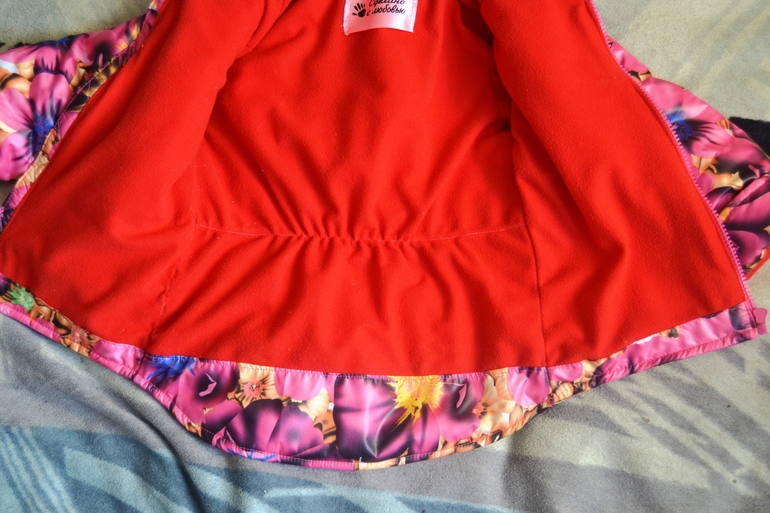 В тушке подклад ворсистой стороной..в капе и рукавах- скользкой.На подборта ткани не хватило.
