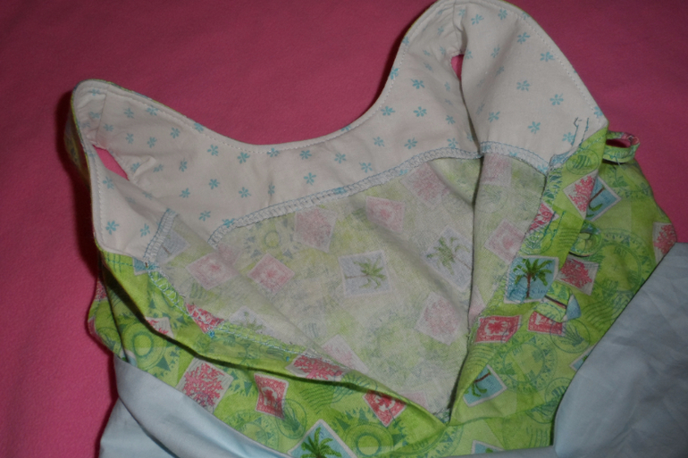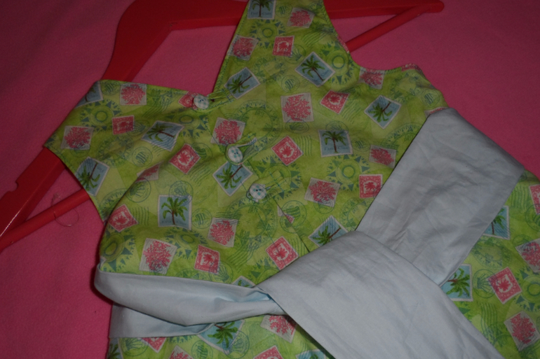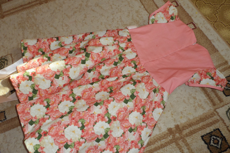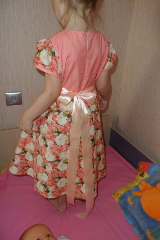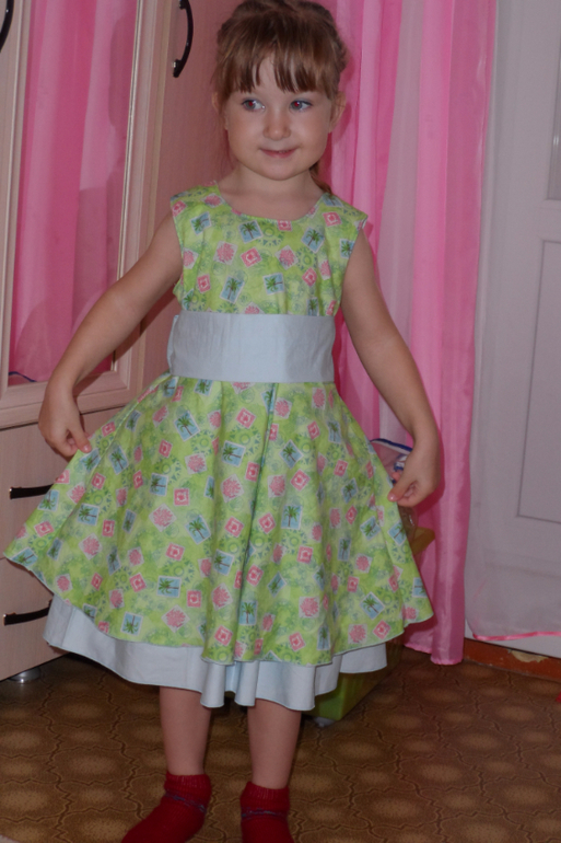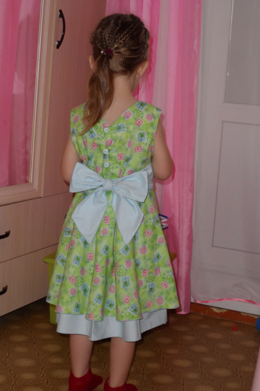 Дальше - платье... так, на повседневку. Тоже ам.хлопок. Правда, тут, думаю,можно было и ситцем обойтись. Больно дорогая себестоимость у платья в песочницу. Юбки здесь две. Верхняя - полусолце, а вторая - сосборенный прямоугольник из завалявшейся дома ткани. что-то типа бязи. Выкройка все та же, только сзади горловину изменила. И застежка - пуговицы. Изначально планировала молнию вшить, но дома нужной не оказалось, а так не хотелось идти в магазин... а платье прям "пищит": дошей меня! В общем, обходилась тем, что есть.