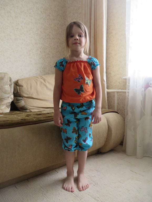 По магазинам хожу крайне редко, так как некому особо с детьми сидеть. Поэтому подарки шила. Первый костюмчик из отреза японского хлопка и подобранного к нему оранжевого компаньона. Выкройку моделировала по дочкиному летнему костюмчику аналогичного кроя. Будущая хозяйка поменьше чем моя дочь. Спереди аппликация - вырезала бабочек из Ткани с бабочками.