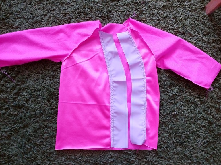ну малышу еще месяц всего, ручонки маленькие, не лезет. А вот старшая уже вовсю помогает. Как только сажусь, она бежит ко мне - мама! давай куртку шить! я вчера выкроила утеплитель и остатки плащевки. Собрала верх и соединила его с утеплителем. Произвели первую примерку.