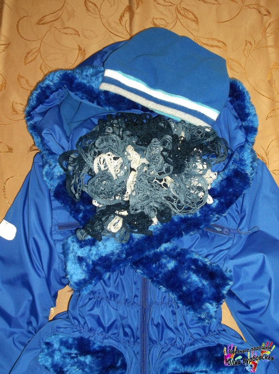 Шарфик какой-то сюда надо, еще не придумала. Достала пока свой (сестренка мне вязала), но он по тону отличается. Или нормально? На Ксюшке на первой фотке он завязан, его практически не видно там. Есть еще светло-голубой флисовый, но он толстый...