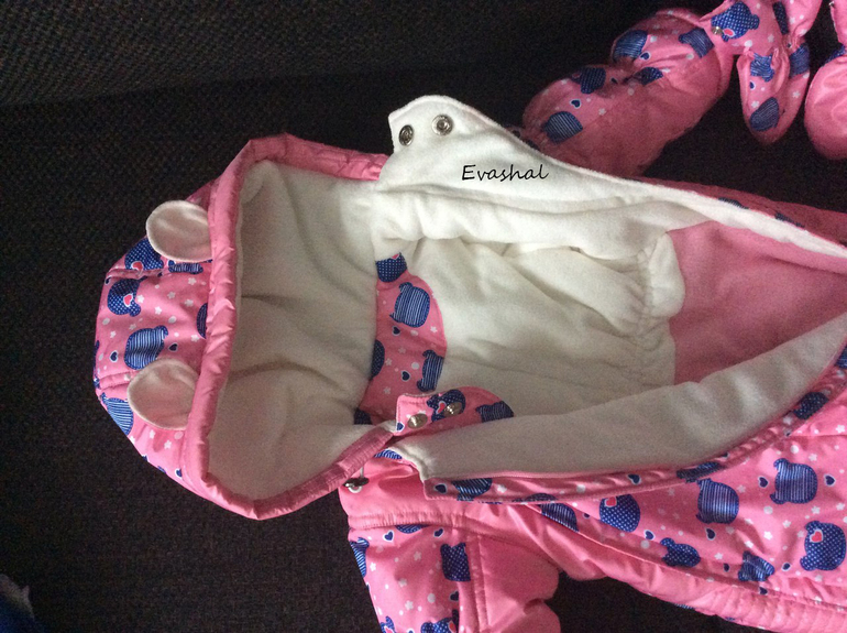 Ткань: дюспа, 150 альполюкса и флис на подкладе. Шила по выкройке 4-2003 мод.8. Выкройку изменяла: капюшон увеличила, углубила; рукав значительно расширила (по выкройке получился очень узкий, молнии подняла до горловины, добавила ветрозащитные планки, штанины тоже расширила внизу, но всё равно немного бы еще хотелось. Пинетки и рукавички на глаз выкроила (прикрепляются внутри на 4 кнопочки рубашечные). Капюшон еще разрезала поперек - сделала цельную планку для того, чтобы вшить ушки.