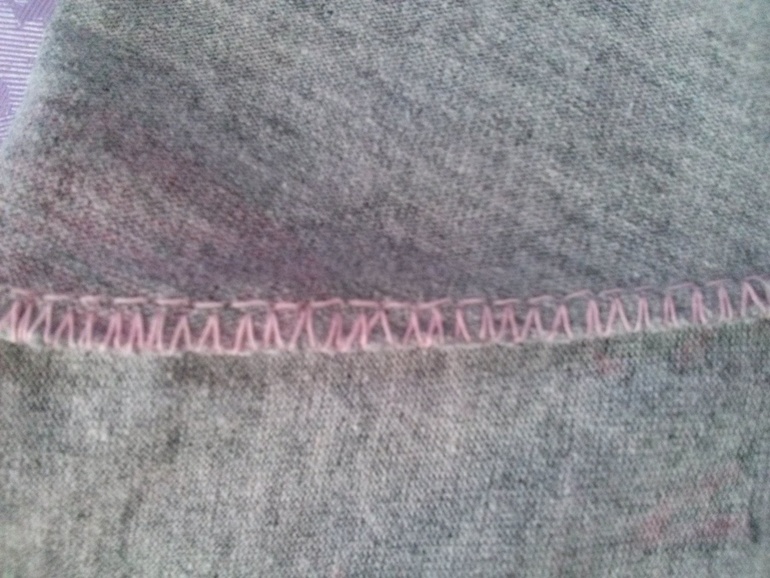 Сначала я прокладываю прямую строчку, а потом обрабатываю край строчкой зигзаг. На машинке Джаноме это строчка С, натяжение нити 2-3. Вот как раз фото, как это выглядит, сохранилось с моих тренировок)) Шью для своих, вполне хватает.