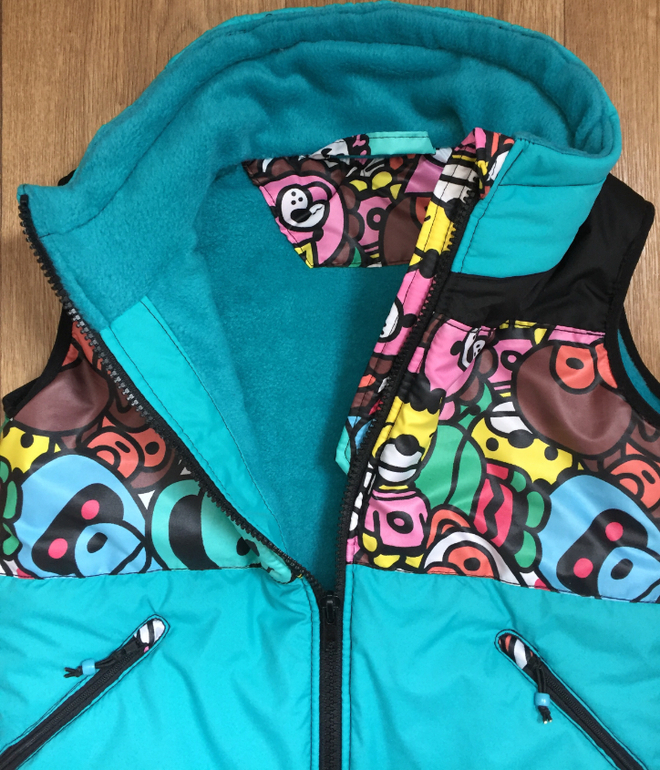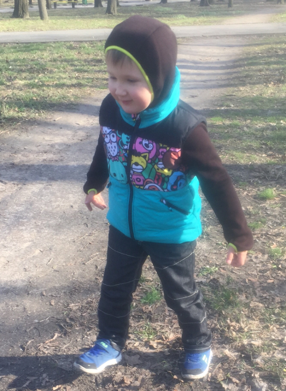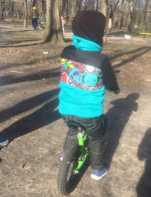 Вот пришлось вставать в шесть утра кроить жилет из остатков, обрезков, лоскутков. На капюшон не хватило и пришлось изобрести воротник чтоб весенний ветерок не лез к сыночку запазуху.