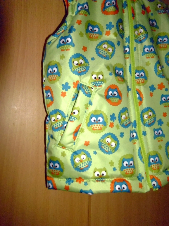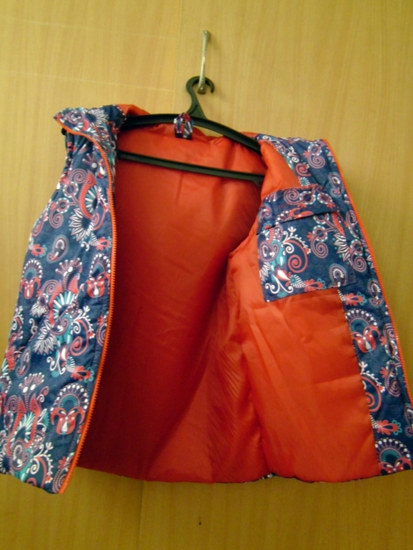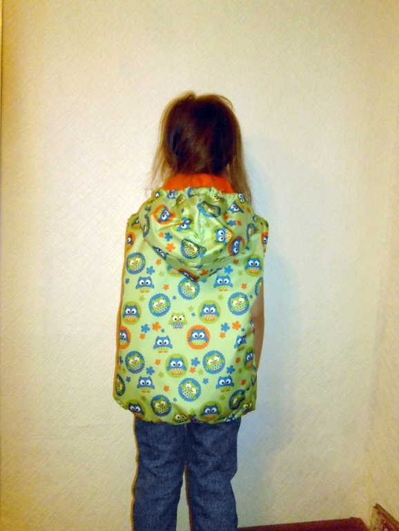 Потом заказали такую же,только девочка нас младше на годик. Сшила по этой же выкройке,но в капюшон вставила резинку и в низ шнур,чтобы утягивать.На маленьких жилетках еще сделала защитную планку у молнии. Меряла тоже Лиса