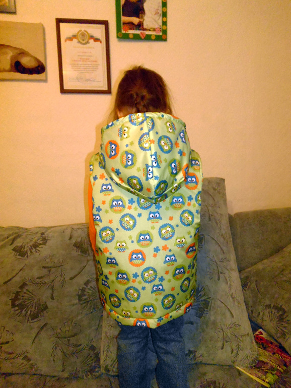 Ну очень мне понравилась плащевка с совятами. Лере сшила уже на рост 146, добавила внутренний карман для телефона,т.к. кармашки с наружи малюсенькие.