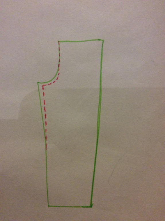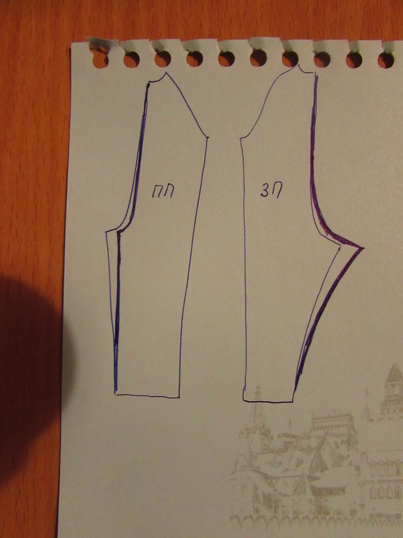 схематично изменения вот. цифры не помню, но если бумажные выкройки сложить и совместить по шаговому шву, то он будет впереди в верху брючины и почти сбоку по низу брючины. Такое расположение шагового шва самое удобное. при наклонах и приседвниях шаг не уезжает назад и сидение не врезается. А главное нет чувства "полных штанов" спереди)))