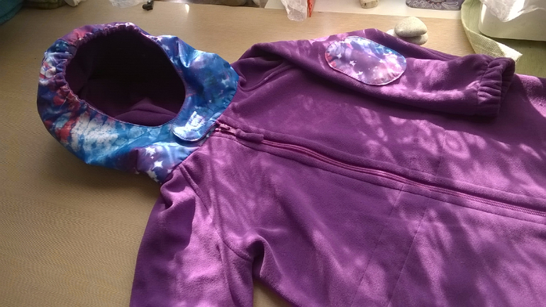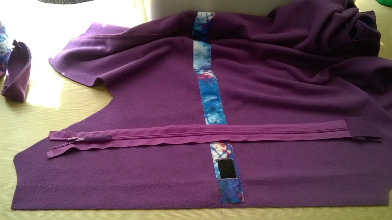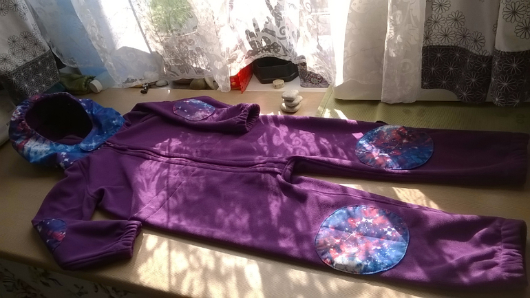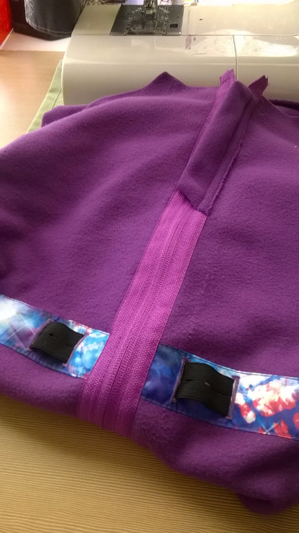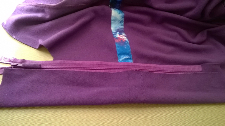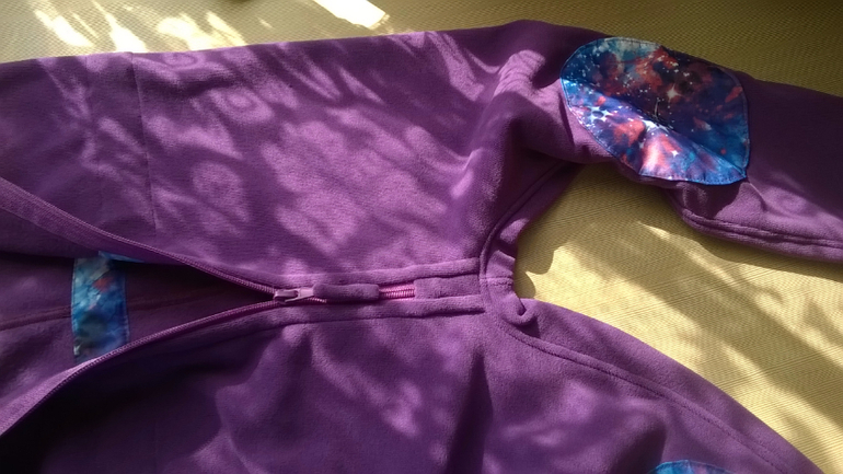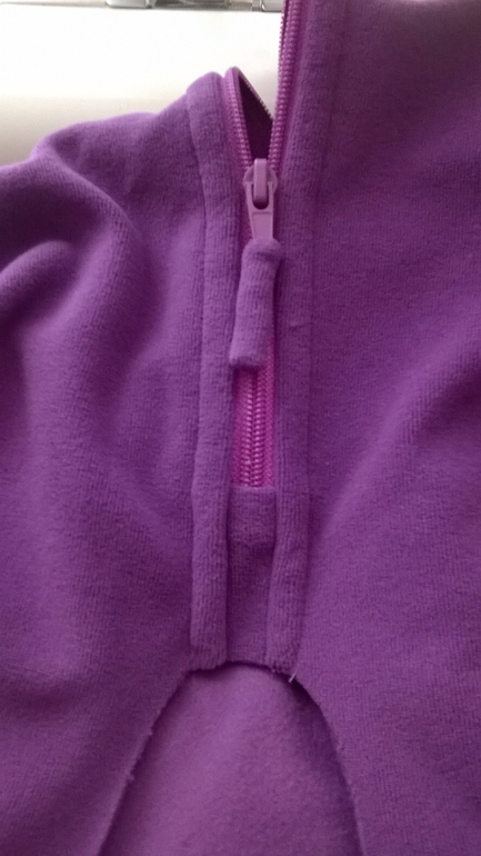 итак молнию вшила, добавила защиту от защемления сверху и сделала отделочную строчку, на изнанке получили аккуратную обработку по молнии. Данный способ вшивания удобен тем что при вшивании молнии не болтается под руками весь комбинезон, а только его часть (т.е. кап и рукава не мешают). Это позволяет выполнить данная модель, т.к. кап не на молнии, а отдельно на липучке, так же можно вшивать если рукав обычный и молния на капе.