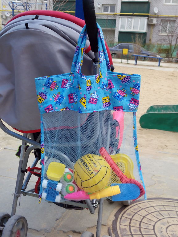 Шьем полезностиСшилась такая сумка для игрушек в песочницу. Выкройку делала сама. Сумка вышла небольшая. Котики-это кулир, бязь на подкладе (продублировала дублерином). Сетка -голубой фатин, окантовала бейкой из кулирки.