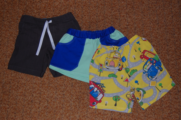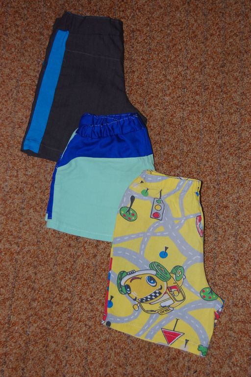 Далее,пошились шорты из разных тканей. Серые -хлопок,это остались штанины от моих брюк. Но ширины не хватило,поэтому вставки сделала из трикотажа. Выкройка из шкатулки(джинсовый комбез),взяла низ за основу. В кармашках и на поясе тоже трикотаж.Зеленые с синим-это тик,дешевая и клевая ткань,единственный минус -сильно мнется.Ошиблась с замерами,поэтому они оказались очень широки,ну ничего,надолго хватит