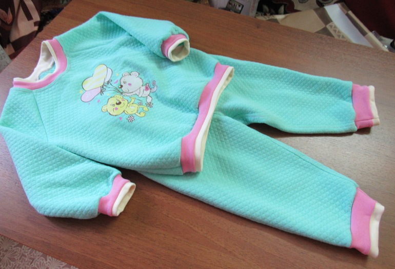 Костюмчик из капитоне цвета ментол, на отделке рибана розовая и ванильная, термотранферы. Получился большеват.