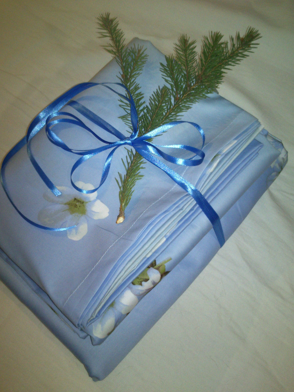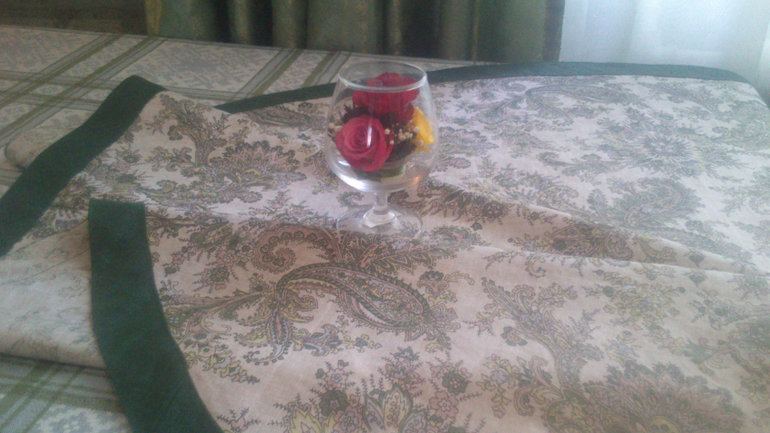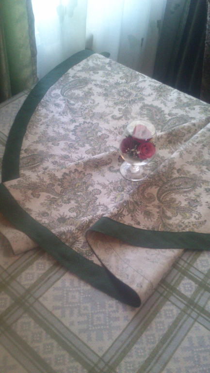 Комплект: круглая скатерть и чехлы на стулья (нет фото чехлов, они темно-зеленые, как кайма на скатерти))
