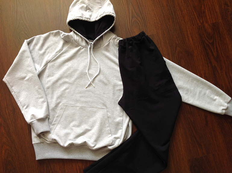Далее костюм мужу из футера с лайкрой. Выкройка из Бурды (номер не припомню), из изменений: в толстовке убрала замок, штанишки сделала уже. Сел отлично!
