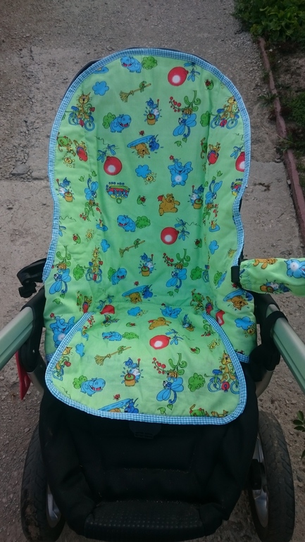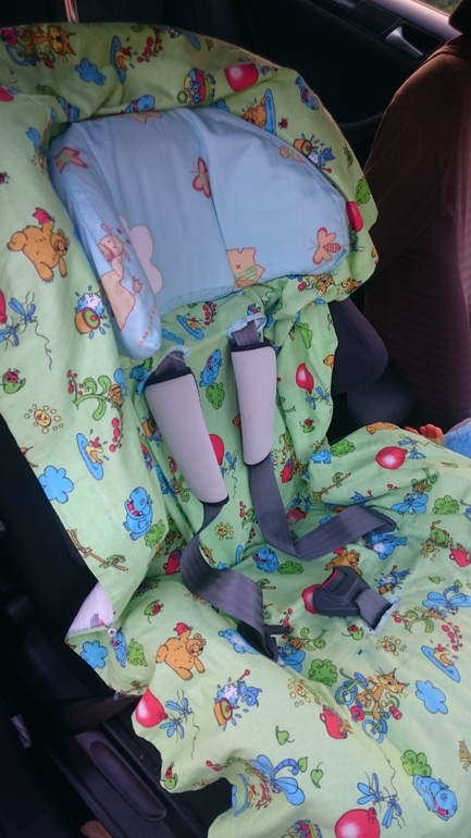 ткани те же. Бязь, прошитая ткань и простыни. Выкройка своя, криваяИ наше автокресло. Ткани те же. А с выкройкой беда. В итоге сделала прямоугольник в несколько слоёв ткани и прорези. Сбоку липучку пришила.