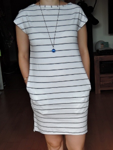 И наконец одно из самых легких платьев, как раз для новичков. Всего-то 2 части (передняя и задняя) и карманы. Модель из Burda 8/2014, в оригинале из черного блестящего материала с прорезями на груди, поэтому почти не узнать. Материал - джерси.