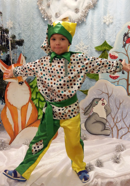 Костюм волка сшит из маминых запасов в виде саржи(подкладочной ткани), мех искусственный куплен в магазине, шапка от НГ подарка (в шапке были конфеты). В жилетке подклад - кусочек серого трикотажа