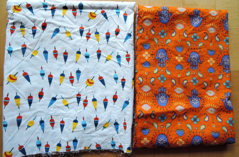 Обе ткани легкий хлопок, продавались отрезком по полметра, за 3-4 евро штука. Производитель белой не указан, оранжевой QjuTie Kids Collection.