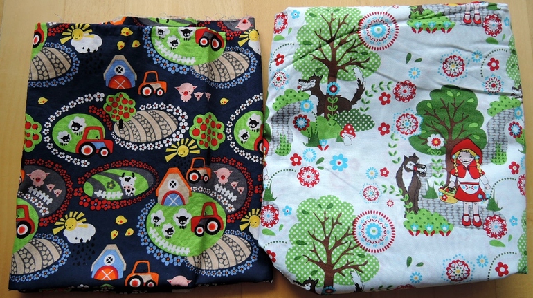 Обе ткани легкий хлопок, 2 евро за метр. С Красной Шапочкой взяла сразу 2 метра, понравился рисунок.Производитель не указан на ткани.