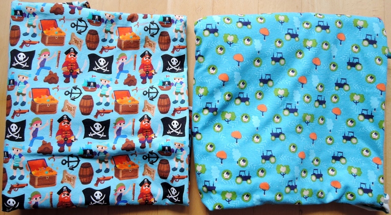 Обе ткани хлопковый трикотаж, с пиратами 4 евро метр, с тракторами 5 евро за метр. Производитель первой не указан, второй by LOTS.