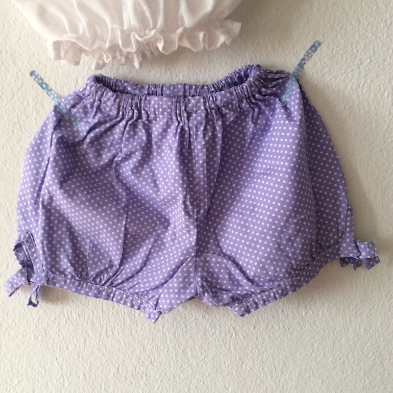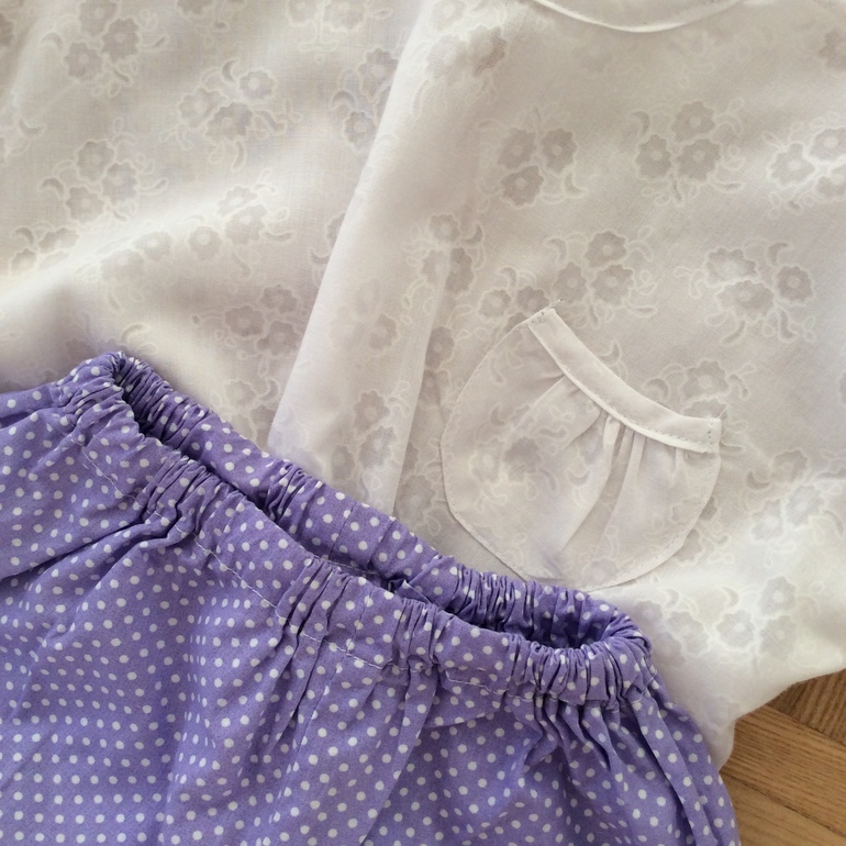 Блузка сшита из легкого хлопка (наверное, батист), шорты из хлопка поплотнее. Блузка очень простая, всего из двух частей, спущенный рукав на резинке. Внизу двойная резинка-сборка. Шорты снизу обработаны косой бейкой с декоративными завязочками.