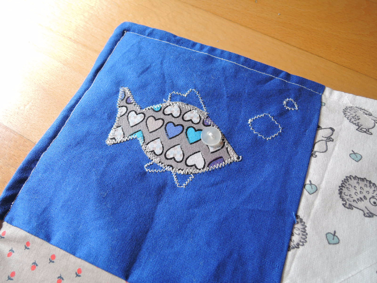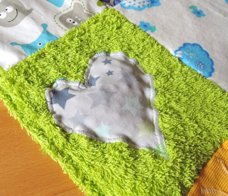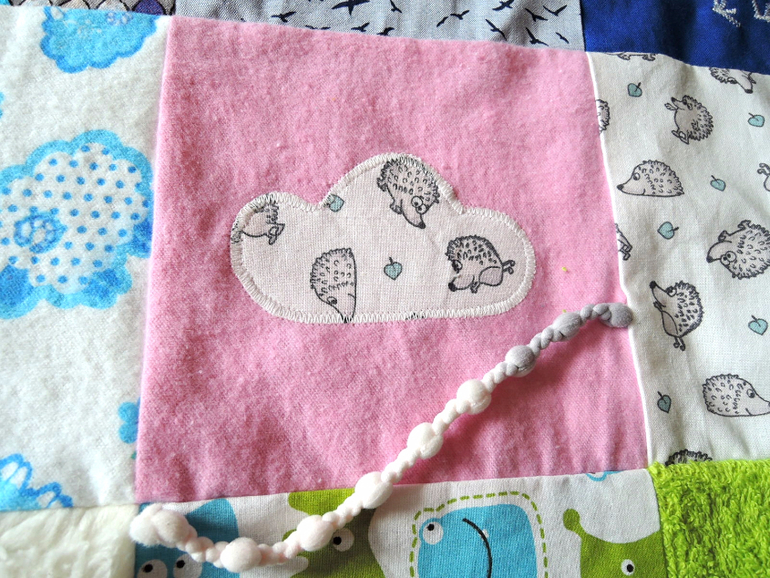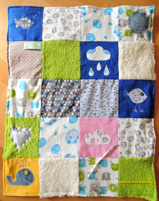 Размеры квадратов в изначальном виде - 16 на 16 см, размер готового одеялка 56 на 72 см. Ткани лицевой стороны - хлопок, фланель, махровая полотенечная ткань и хлопковый тедди плюш. Кроме того, веревочки, шуршащая пленка, пищалка, вишневые косточки. Ткань изнанки хлопок, простроченый квадратами с флизелином, чтобы придать мягкость коврику.