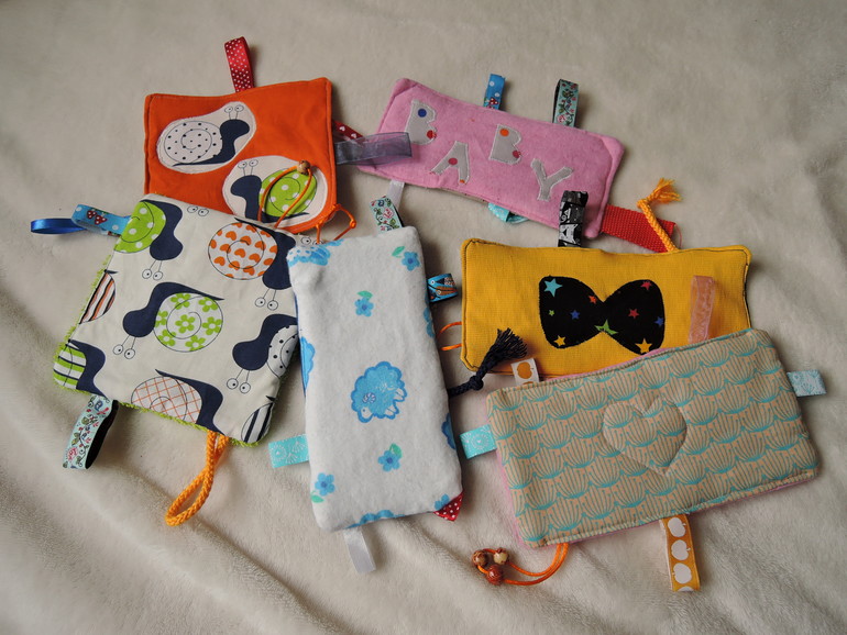 Под шуршащими платочками имеется ввиду вот это. Материал - остатки тканей и веревочек, внутри каждого шуршащая фольга. (Бусины сначала пришила, но сейчас отрезала...показалось небезопасным).
