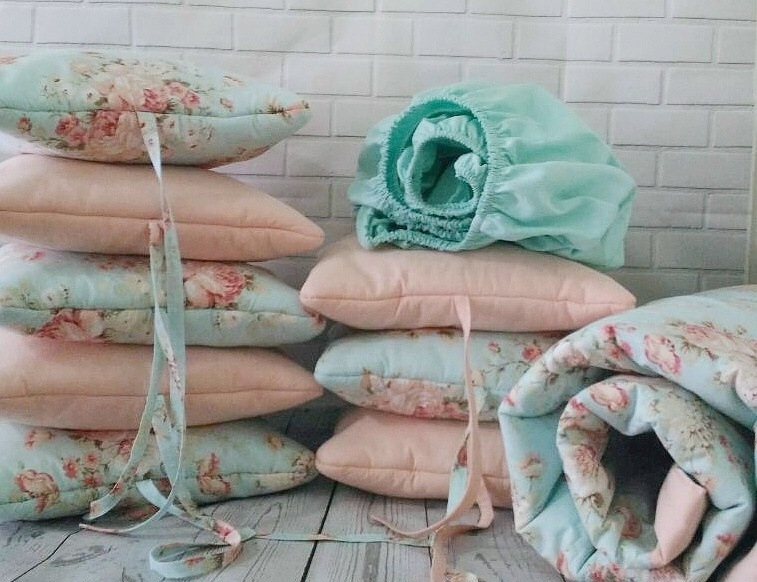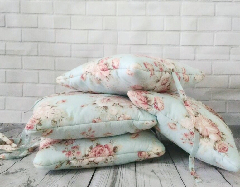 Бортики подушки. Кроим на одну подушку 2 отреза ткани и два отреза синтепона размером 35*35. а также полоски ткани 35*4см на завязки. Я делаю две завязки на подушку. Полоски ткани прогладить утюгом и прострочить, т.е сшить завязочки. Квадраты из ткани для будущей подушки сложить лицом к лицу, между ними положить готовые завязки. чтоб они были внутри. закрепить иглами чтоб никуда не сдвинулись. затем это все положить между двумя квадратами синтепона. и прострочить весь этот "Бутерброд" по краям, оставив отверстие см в 10 для того чтобы вывернуть. по углам подрезать лишнее, вывернуть все хорошенько расправить и вот у вас готовая подушка. ее можно оставить в таком виде, а можно набить в середину еще наполнителем до нужной полноты подушки. я набиваю еще совсем чуть чуть и взвешиваю подушку, чтоб все вместе весило 140-150 грамм) и все подушки взвешиваю, чтоб были одинаковые. Останется в конце вручную зашить отверстие потайным швом и все готово)