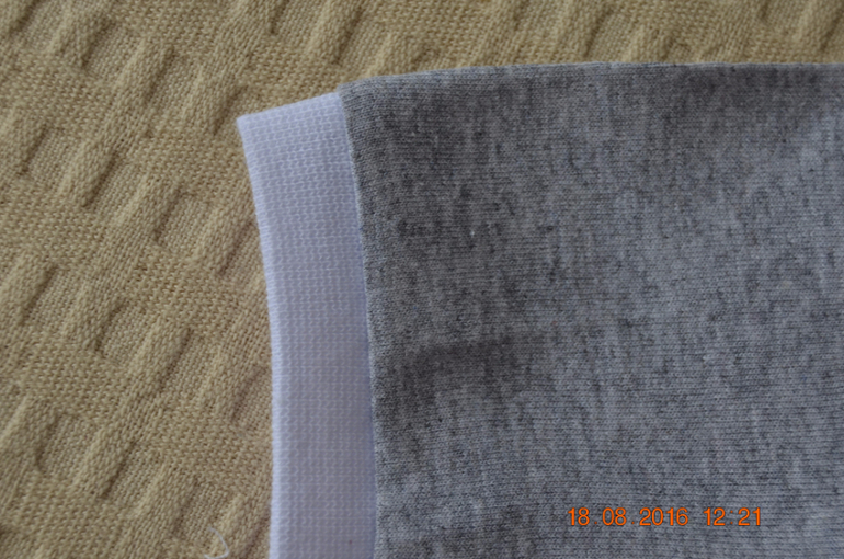 Горловина из рибаны, шов закрыла кусочком кулирки серый меланж, в тон карману.