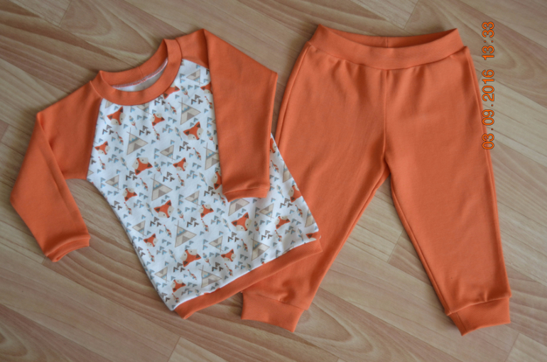 Ткань интерлок, выкройка кофты своя, выкройка штанов с простора интернета. Брала 80 размер, но пришлось ушивать, т.к. получились огромные на наш 75 см рост! У кофты перед и спинка - принт.