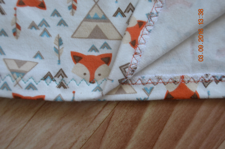 Швы отстрочила эластиным зигзагом, нитками в тон бирюзовому кашкорсе, который на манжетах.