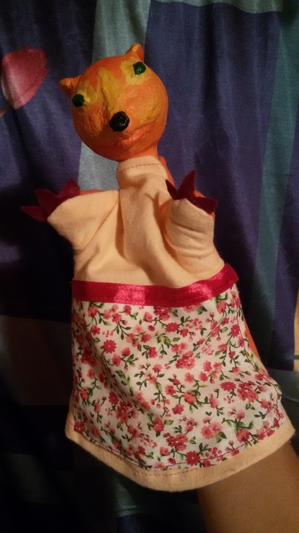Мечта у меня проводить для моих деток кукольные спектакли. Мама мне отдала еще советских кукол, она с другими мамочками в свое время нам показывали спектакли. Но эти куклы, мягко скажем, страшные, тк увы время никого не щадит;) вот и решила я пошить костюм, а потом раз уж взялась, то и голову сварганила в технике папье-маше. Это из бумаги ) котик получился что надо, малыши сразу потребовали себе на руку одеть, но эх большеват для них (голова 8см в диаметре), сделала тогда поменьше чуток - Лисичку-сестричку.