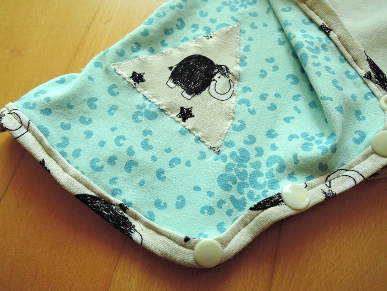 Наткнулась недавно на вот этот мастеркласс (с выкройкой) и решила сшить парочку в размере 62-68. Материал - трикотаж, бейка тоже. Кнопки пластиковые.