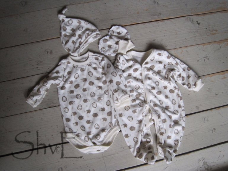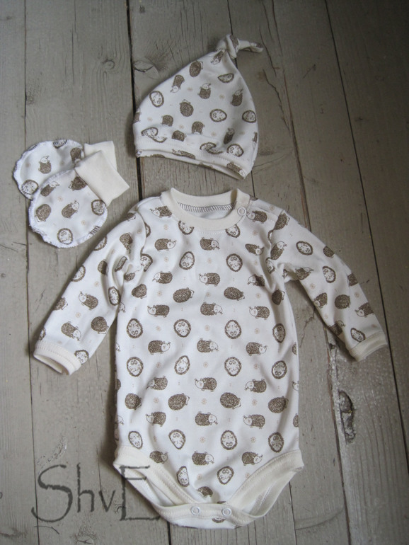 В догонку к сшит такой трикотажный наборчик из нежного интерлока с ежиками, на окантовке рибана с лайкрой, кнопки prym.