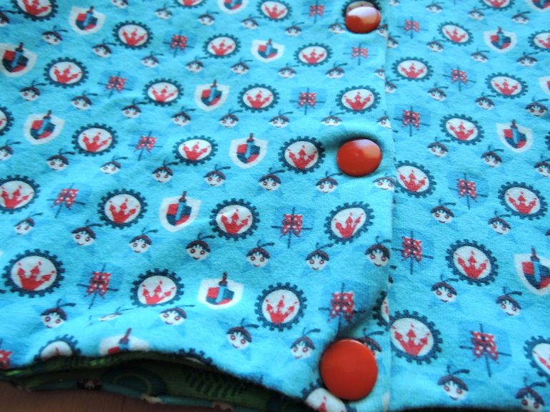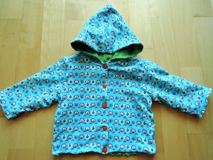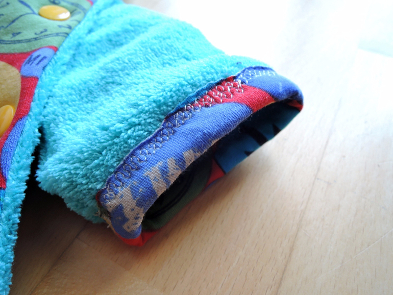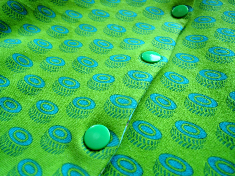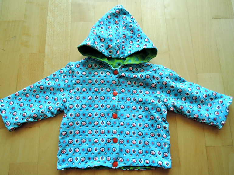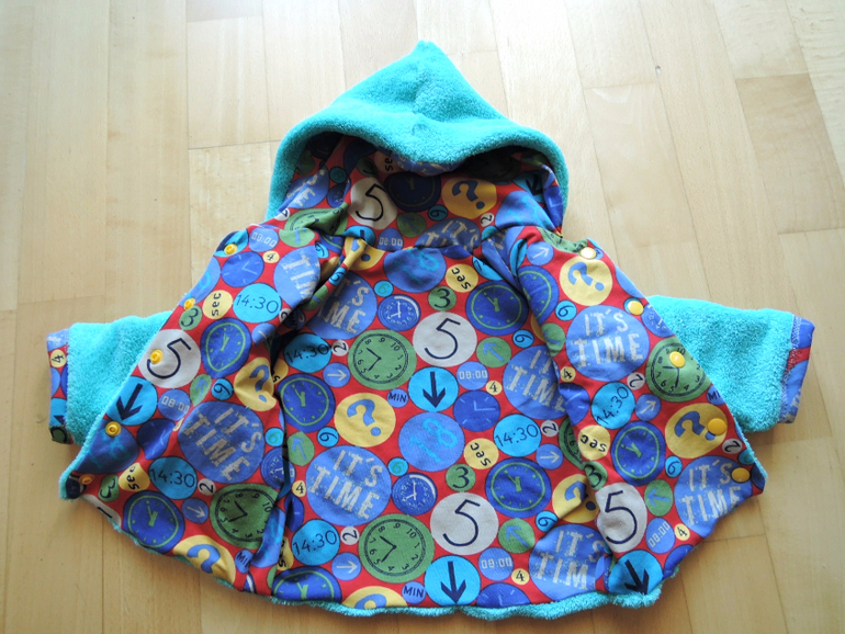 По этой же выкройки кофточка потеплее. Она тоже вроде как двухсторонняя, но носить скорее всего будем только трикотажем внутрь. Как бирюзовый материал называется не знаю, купила плед и с него кроила. Ткань с часами - трикотаж, кнопки пластиковые. Рукава обработала по другому.