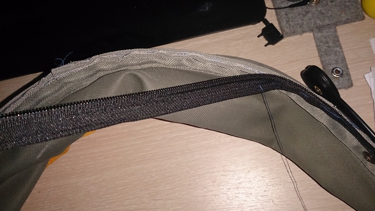 пришивает ответную часть такой же молнии на капюшон.