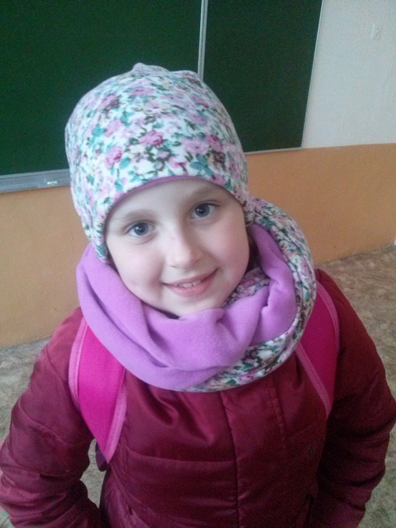 Сначала сшила снуд по окружности головы. Но он сидел плохо, не прилегал, шея открытая. Второй сшила на всю ширину ткани - 160 см. Получилось очень длинно для ребенка. Пришлось опять распороть, срезать см 20. Теперь, вроде, ничего. Расцветка мне не очень нравится, но из оттенков, подходящих к моему флису, этот самый лучший))). Дочь довольна)