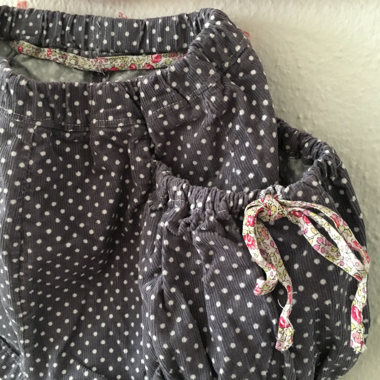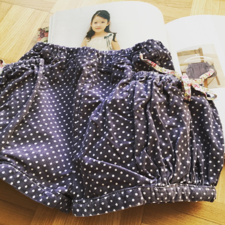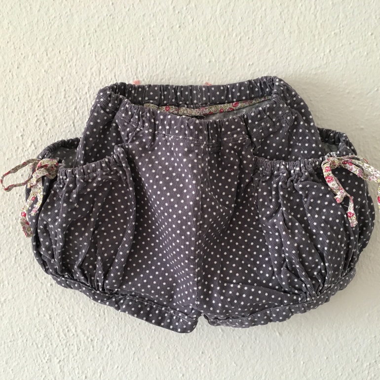 Шорты сшиты из вельвета в рубчик, очень удачная модель получилась, а главное, очень понравилась дочке. В шортах очень вместительные карманы на завязках, туда отправляются все камешки, каштаны и желуди, найденные на прогулках. Завязочки на шортах - в тон блузке. Внутри поясок в шортах обработан косой бейкой, спасибо за советы из прошлого поста.