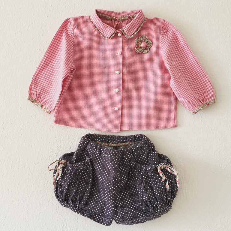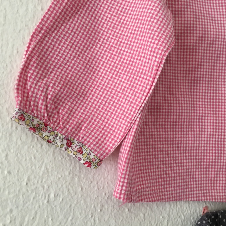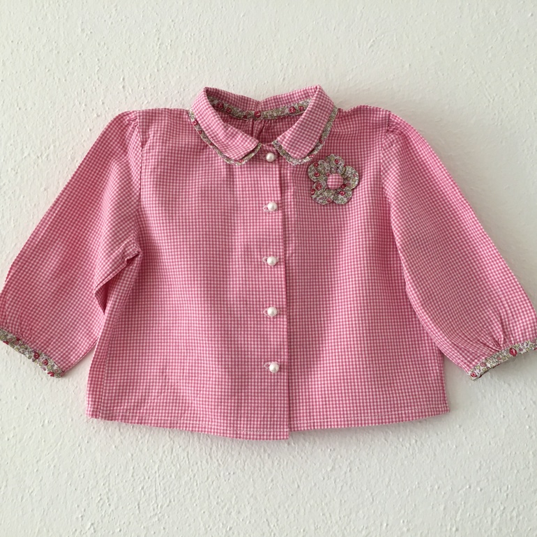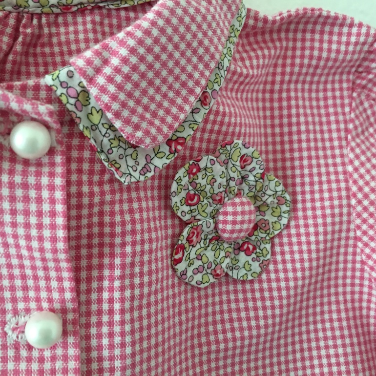 Блузка из розового в клетку хлопка, второй воротник, косая бейка и цветочек - остатки хлопка из коллекции Liberty (обожаю их цветочные ткани). Цветочка и двойного воротника в модели не было, но дочка его сразу оценила цветочек, а второй воротник добавила для красоты:)