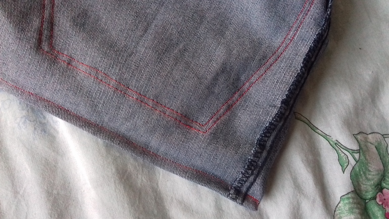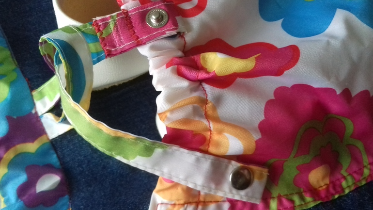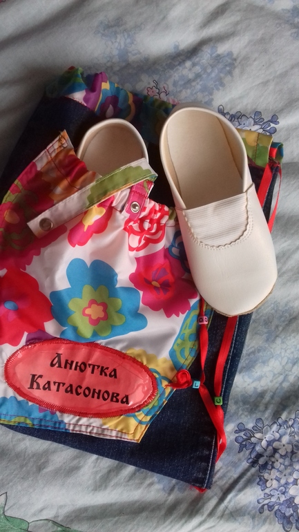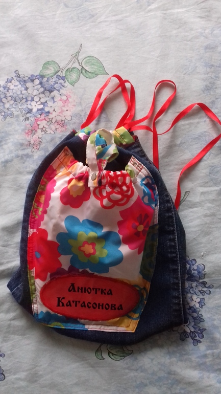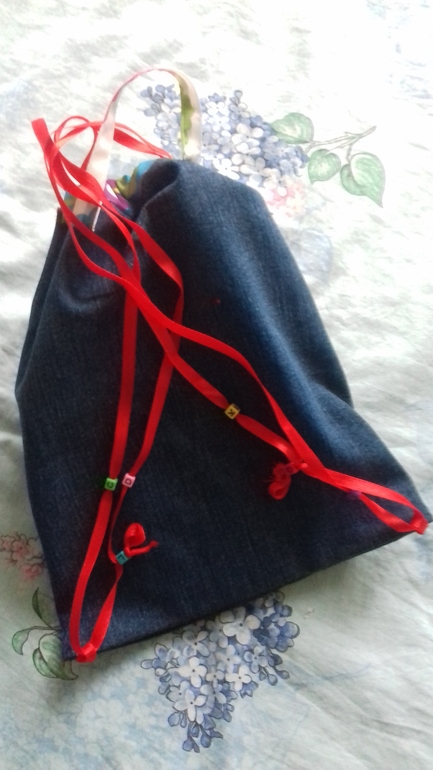 ...А получился мешочек для дочки)) Очень бюджетный вариант. Никаких выкроек: кусочек штанины (с готовыми швами) и одна секция полотна зонтика + готовая тесьма с кнопкой с него же)).