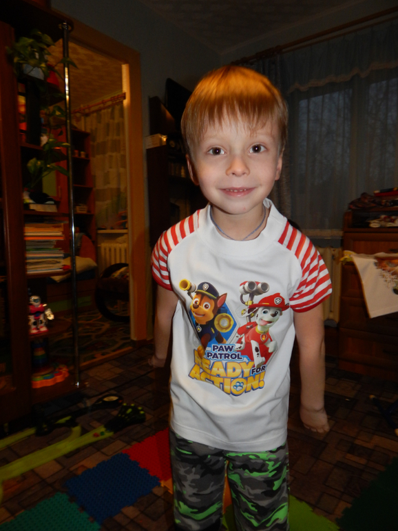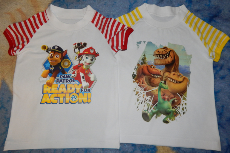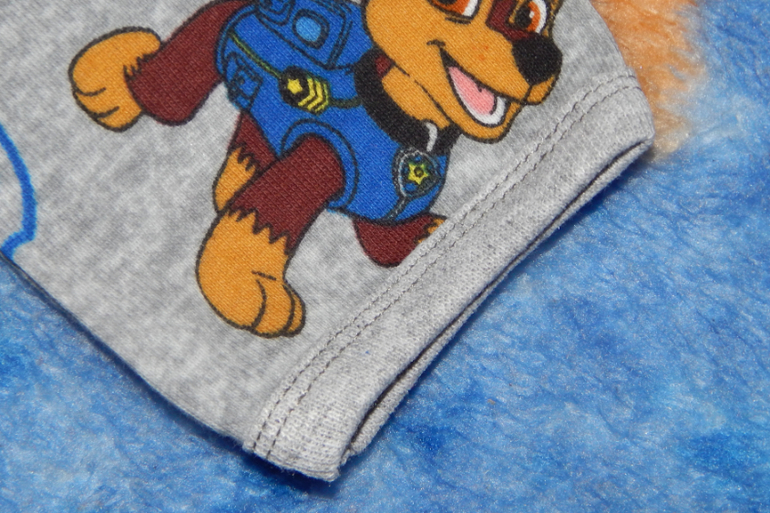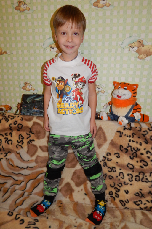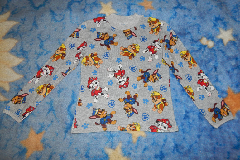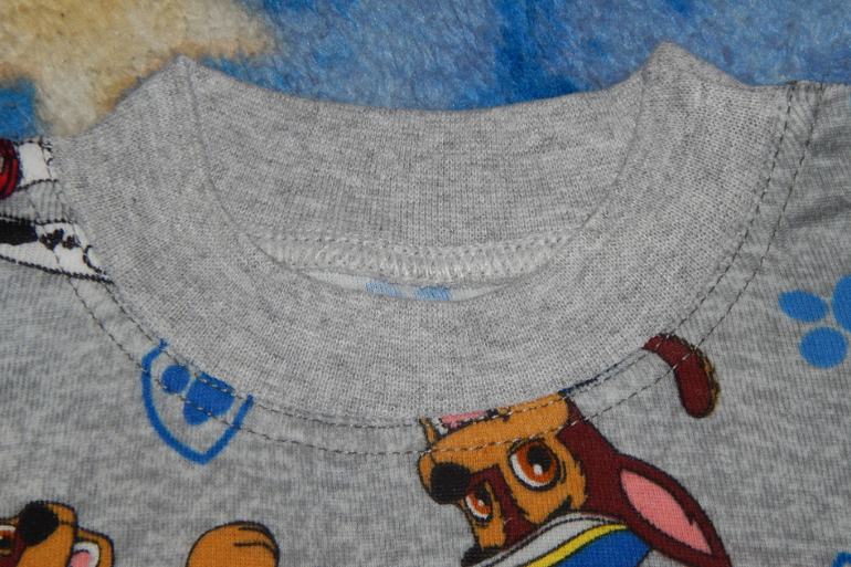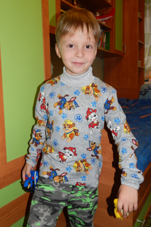 4) Водолазка из рибаны-ластика. За основу взята выкройка футболки Отто 2011-3, модель 19. Рукав заужен и дорисован до нужной длины. Ворот из рибаны с лайкрой. Щенячий патруль рулит, щенячий патруль везде, только трусов с щенками у нас пока еще нет