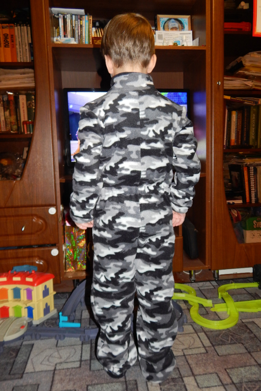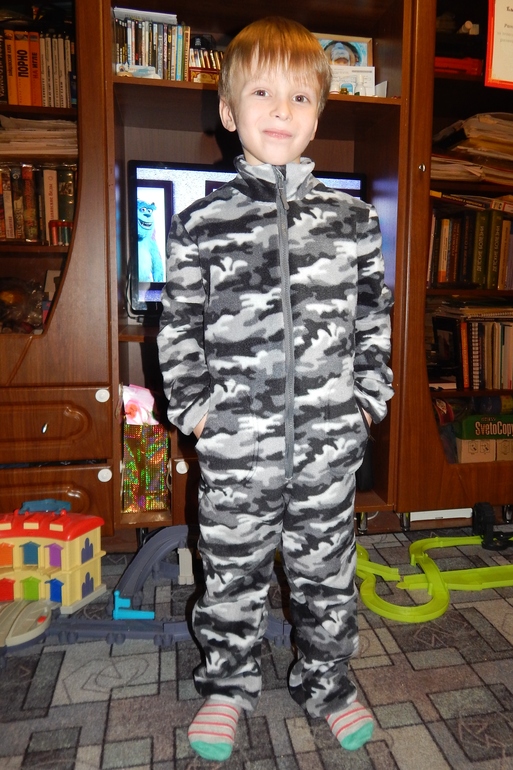 Из Оттобре 6-2010 мод. 13. На рост ребенка 117 взяла размер 116, ребенок худой, поэтому припусков в ширину на швы не делала. Удлинила в длину по телу на 5 см (у нас длинное тело и короткие ноги, поэтому покупные поддевы давят на промежность и штанины длинные), ноги не удлиняла, рукава удлинила на 4 см, но зря. Рукава надо было тоже оставить штатными по выкройке. Талию не стала делать отрезной, все склеила в одну монодеталь (единая деталь переда и единая деталь спинки, спинка со швом). Сзади поставила резинку в кулиску из кулирки на талию (кулиска настрочена изнутри). Карманы. Внутренняя планка с защитой от защемления (один слой флиса + слой кулирки) Кажется все.