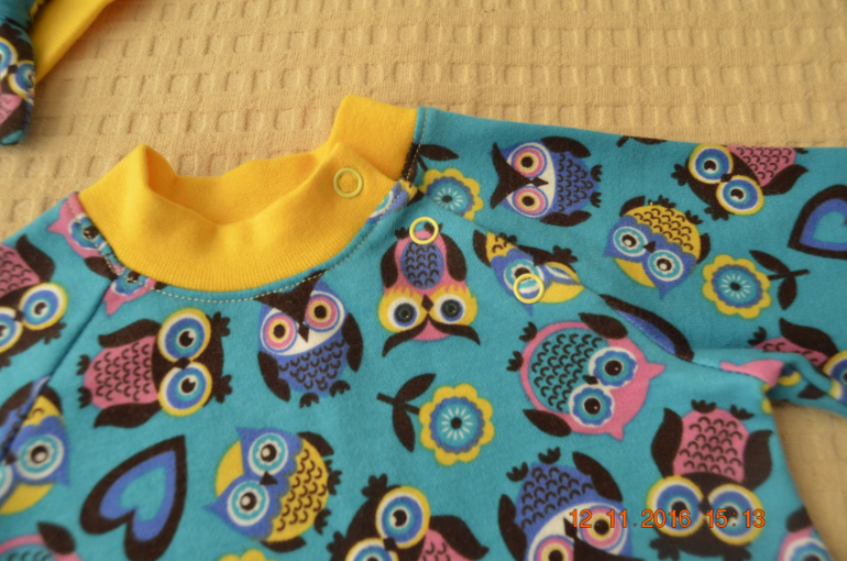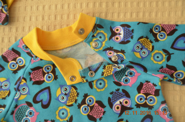 т.к. рукав реглан, то для удобства одевания (все-таки размер маленький 74) сделала застежку на кнопках. Мудрила сама, в итоге что-то даже получилось ))