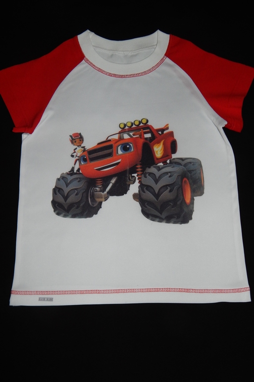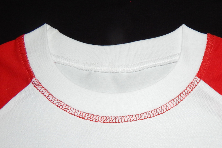 Перед белый сандвич для сублимаций, спинка и рукава кулирка с лайкрой, на горловине рибана. Низ и горловина обработаны с имитацией верхнего застила. Надо было бы, конечно, ещё поменять нитки на белые и рукава так же отстрочить, но эта мысль пришла мне уже потом. Смотрелось бы гармоничнее, оставим эту идею на следующий заход :)