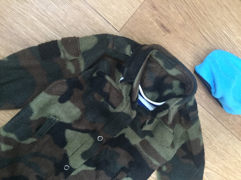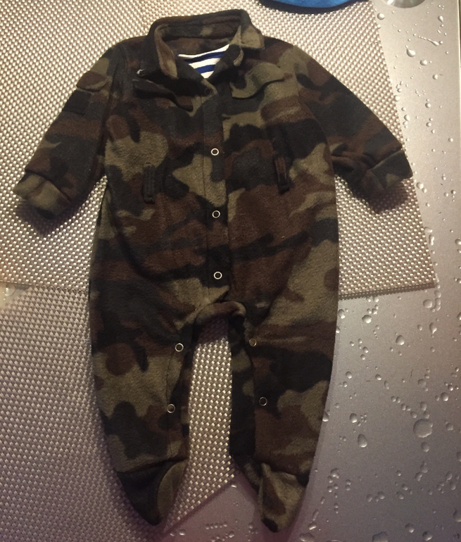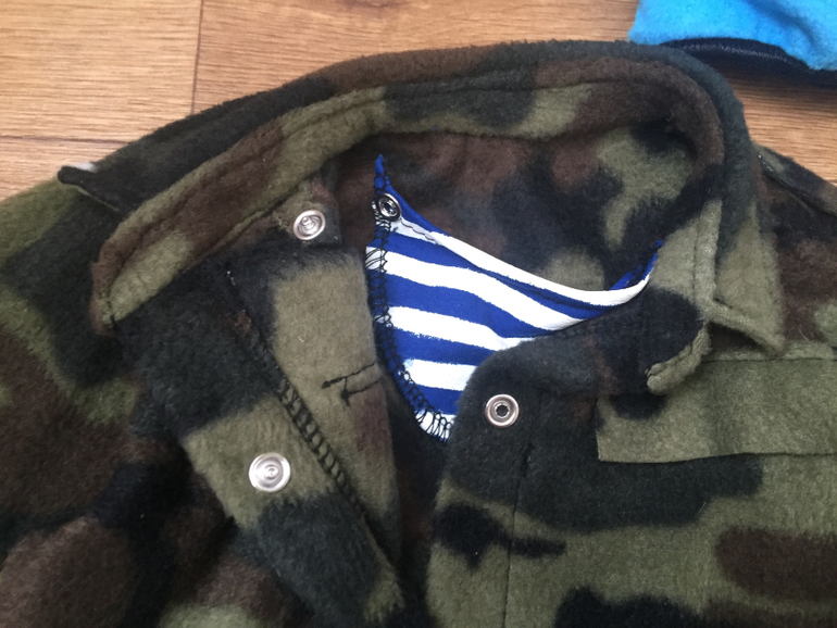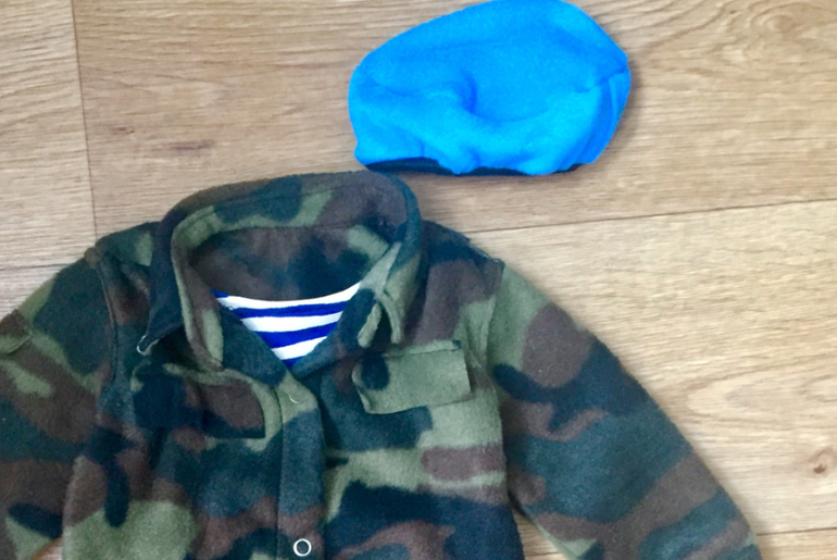 Этот костюмчик Голубые береты. Пошит дочке военного. Тельняшки не было, покрасила Деколой кусок синего футера. Выкрокройка та же, размер, функционал тот же, только застежка другая.
