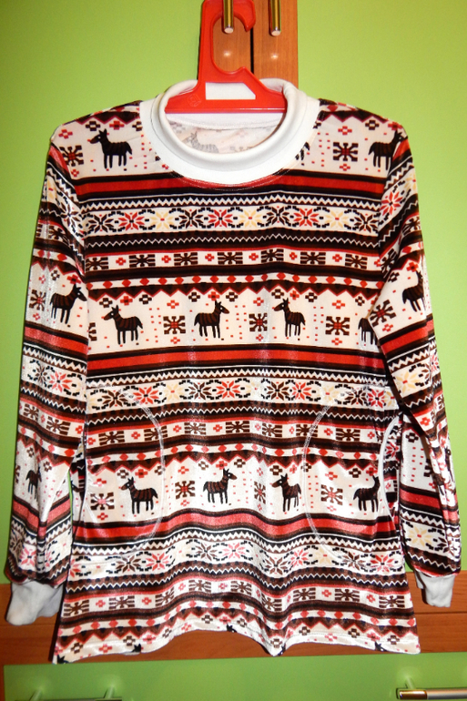 Материал: велюр стрейч. Добавлены карманы и воротник стойка из рибаны. Ткань на ощупь прекрасна, смотрится здорово, но есть одно большое НО - обратная поверхность шелковистая, скользящая. Если сверху халат или куртка одеты, то поднимается весь кофтец вверх до уровня подмышек - очень неудобственно, приходится рукой все время вниз стягивать, прежде чем расстегнуть куртку на вызовах.