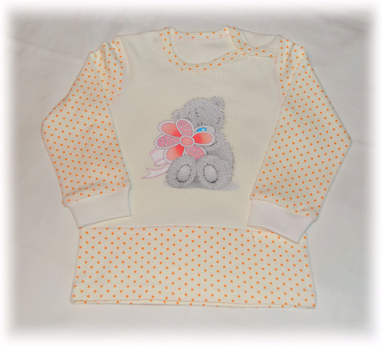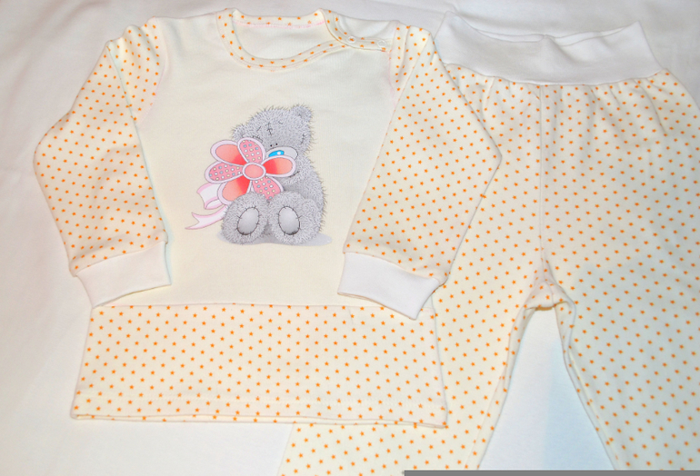 Как же приятно шить на малышек. Попросили меня тут сшить пижамку на годовалого мальчика и тут понеслось, попросили повтор из этой же ткани - звездочки на экрю ( сама балдею от неё). Но только девочке, поэтому термотрансфер мишка с бантом. Кофточку шила по выкройке из Оттобре 4/2011, модель 7, штанишки - выкройка с сайта "Шкатулка", очень мне нравится эта модель. Рост 80.