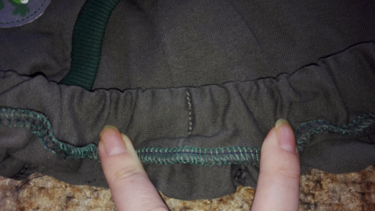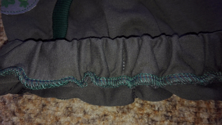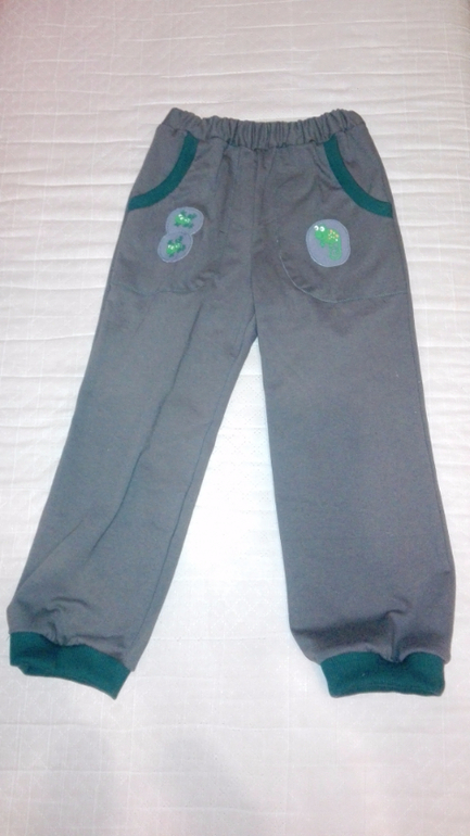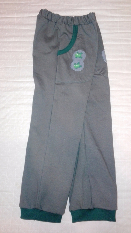 Далее получился комплект) Штанцы из хб кулирки с отделкой из кашкорсе. Купила в местном магазине,чему была приятно удивлена))) По той же выкройке,что и предыдущие. Только пояс притачной с резинкой и карманы другие. Настрочила аппликацию-мне не нравится,но отпарывать не буду,дырки мне не нужны(