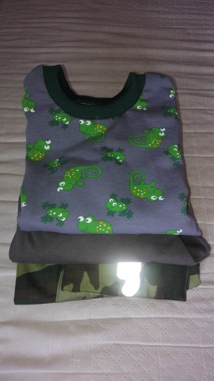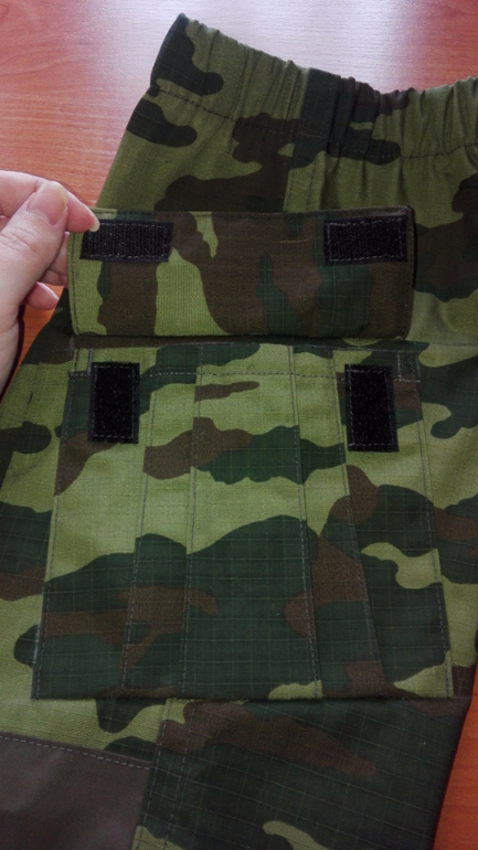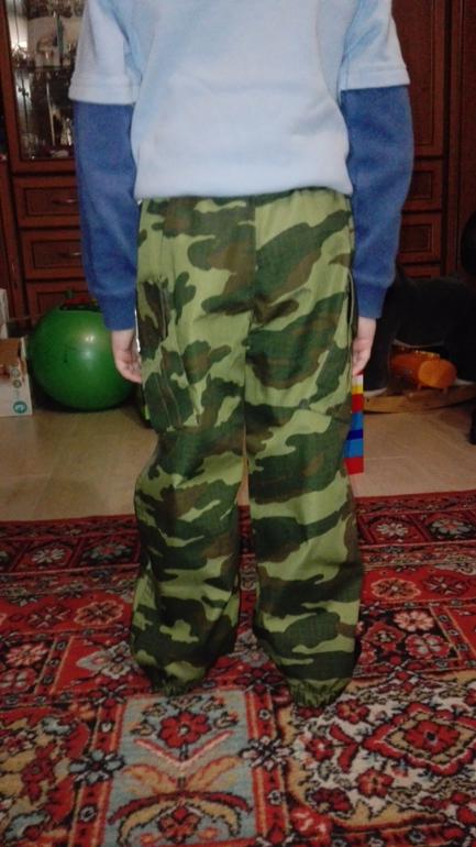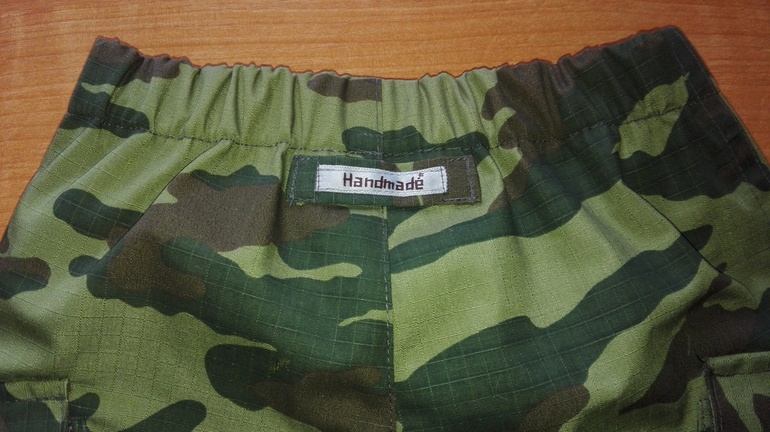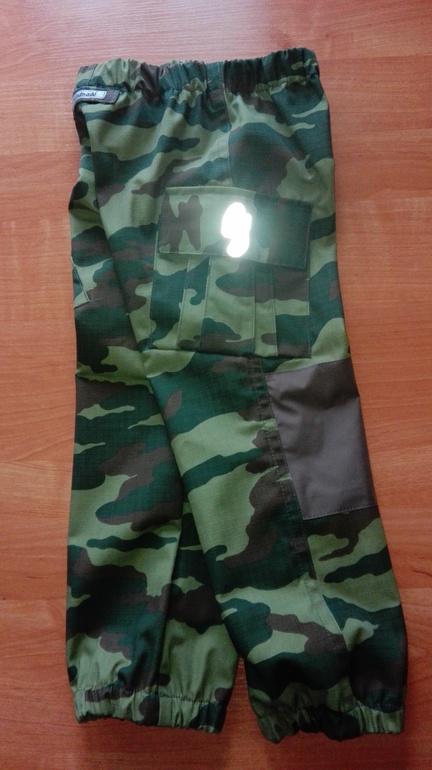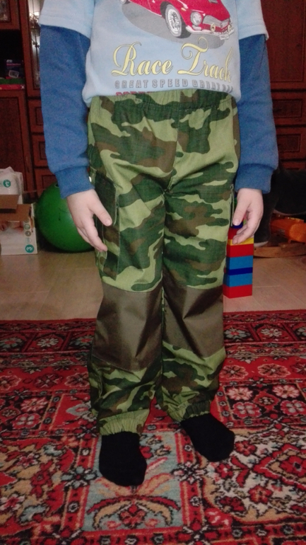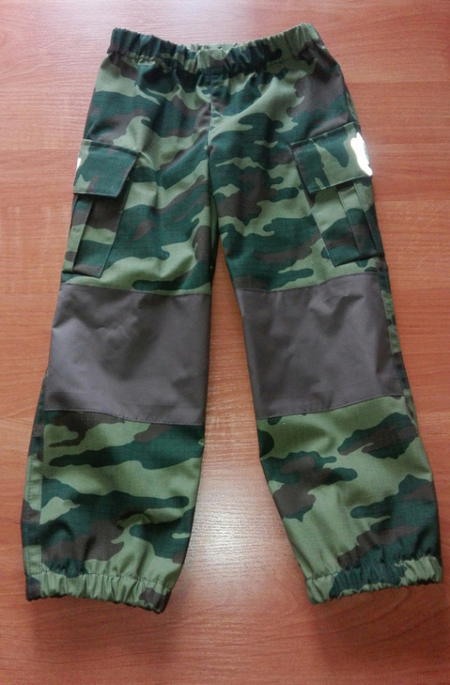 Брючки камуфляжные я уже шила,они из Оттобре 1/2014 м.18 на рост 110см. В лекалах ничего не меняла. Ткань-хлопкосодержащая плащевка производства Белоруссии. В этот раз не стала выстрачивать ящерицу,но сделала два кармана. На коленках накладки из однотонной плащевки.
