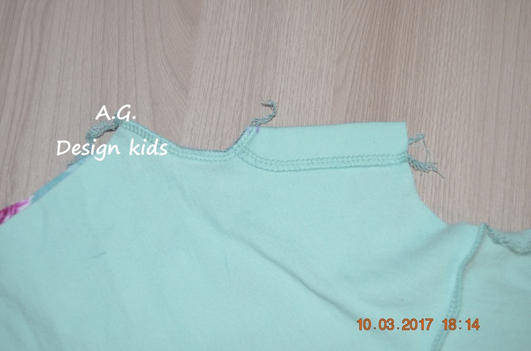 Итак, начнем с нюансов раскроя. При раскрое рукавов по линии реглана прибавляем планку шириной 4 см и длиной по вашем усмотрению ( в моем случа планка была 12 см).Этот припуск обрабатываем оверлоком, с небольшим скруглением, как бы срезая плавно один уголок.На фото ниже спинка изделия уже соединена с рукавами.