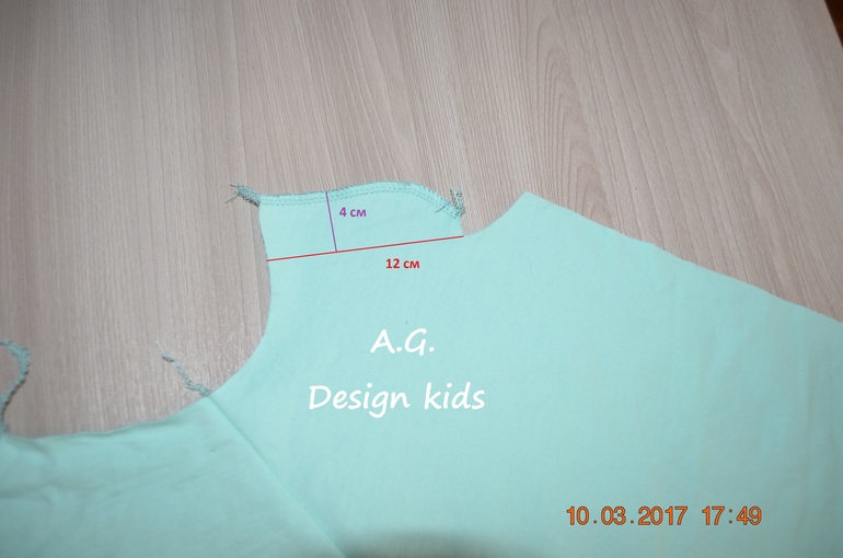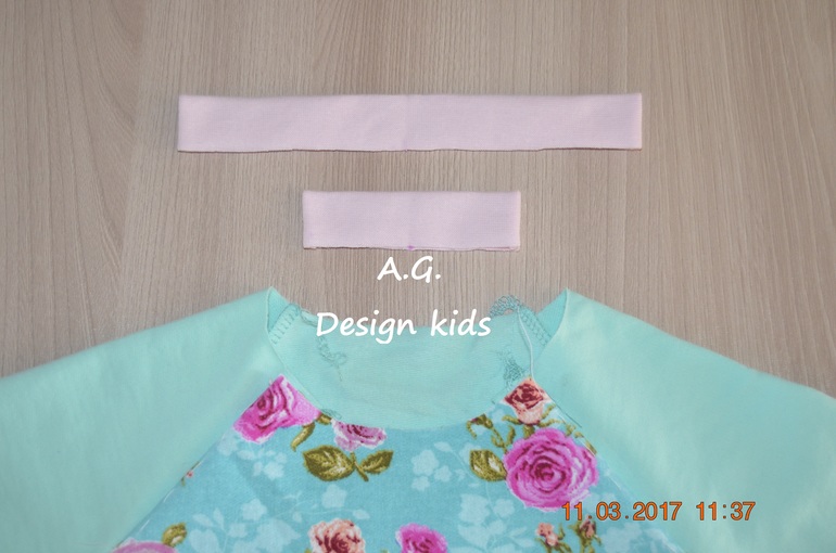 Следующий этап -обработка горловины рибаной. Измерям нашу горловину, состоящую из двух частей: 1)перед и 2) спинка + рукава. Выкраиваем обтачку, так же состоящую из двух частей.